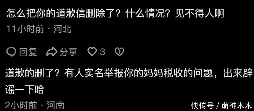 而闫学晶始终都没有回应税务相关的问题,儿子林傲霏账号上的道歉信还删除了,合着这道歉还是3天限定?