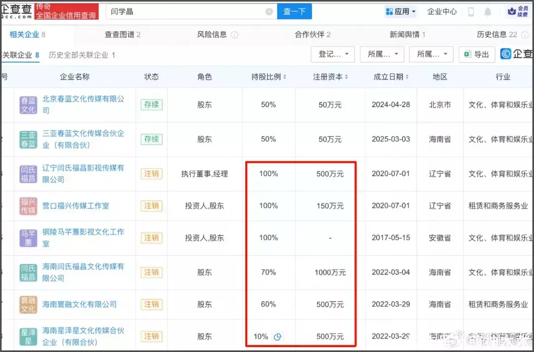 此外网友还注意到闫学晶曾关联8家公司,有6家公司在几年前都陆续注销,但注册资本引起网友注意,在直播间哭穷的闫学晶,此前还能拿出上千万开公司?难道现在是创业失败赔钱才哭穷?