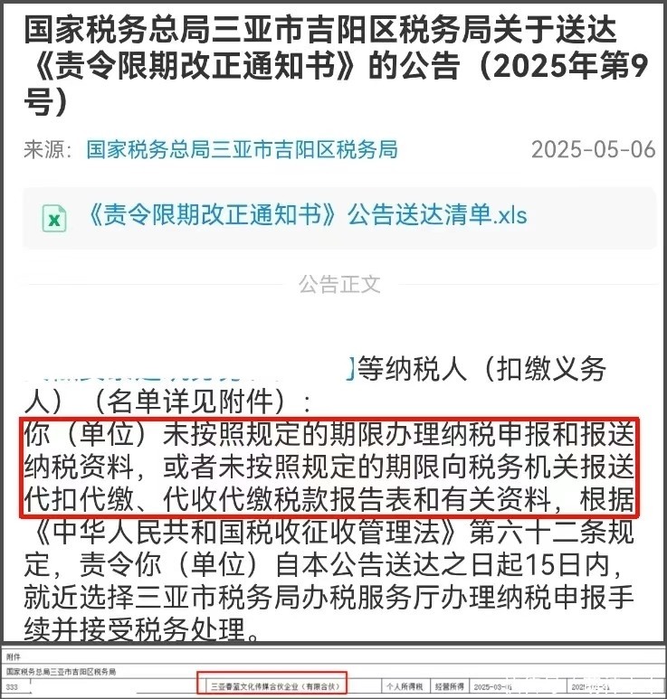 还有网友扒出闫学晶公司之前还被税务局下发了《责令限期改正通知书》,疑似是没有在规定期限内报税纳税,被网友质疑偷税漏税。